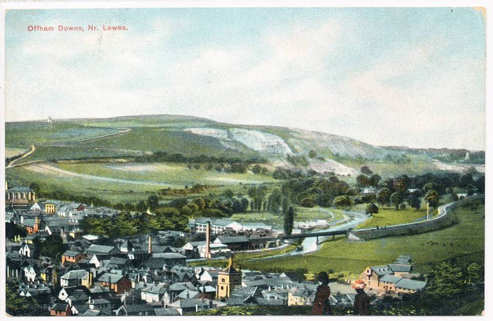 This postcard shows an Edwardian view from Cliffe Hill – with the colour added afterwards in the studio. In the foreground can be seen Cliffe church. Behind the railway from Lewes to Uckfield snakes across Malling Brooks on an embankment, crossing the Ouse near where Tesco is now. Behind the railway is the Phoenix Ironworks. Most of St John-sub-Castro church creeps in on the left edge of the picture. The fields of Landport Farm are below the rural Offham Road. Hill Road branches off from Offham Road, heading for Steere’s windmill on the skyline.