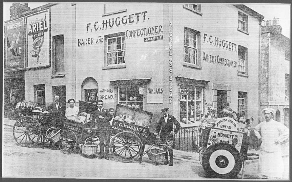 F.C. Huggett’s baker’s shop, shown in an Edwardian photograph provided by Jean Smith, was on the corner of Lancaster Street and North Street. Several generations of the family were bakers in St John-sub-Castro. Housewives expected bread delivered to their door. The building is still there.