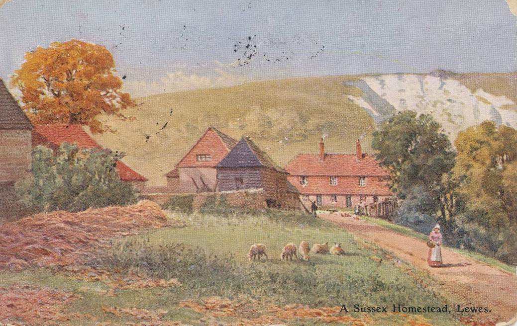 This Edwardian art postcard is titled just ‘A Sussex Homestead’, but it shows the cottages and farm buildings of Landport Farm, with the Offham chalkpits in the background. It must have been very popular in its day, as copies still turn up very regularly, more than a century later. It was probably sold over a wider area than just Lewes – this card was posted from Brighton in 1906.