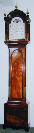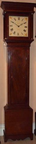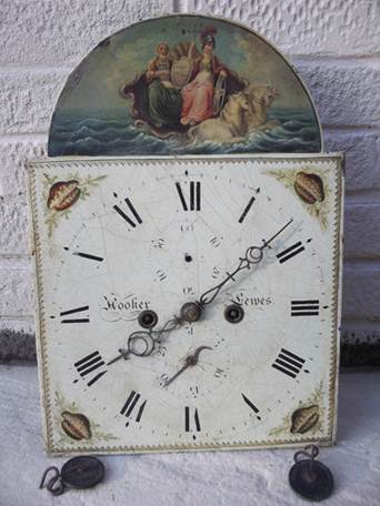 The clock movement below (left) by William Hooker of Lewes (clockmaker 1803-1832) was advertised for sale on ebay in April 2012. It was described as an 8-day long case clock movement, with a dial, featuring Britannia, painted by Walker & Hughes of Birmingham. Another, rather grander-looking, clock by him is shown to the right, and an 1820 clock with a plainer case below. There is a 30 hr longcase clock by him in the British Museum collection. The Museum catalogue gives his address as Cliffe High Street.