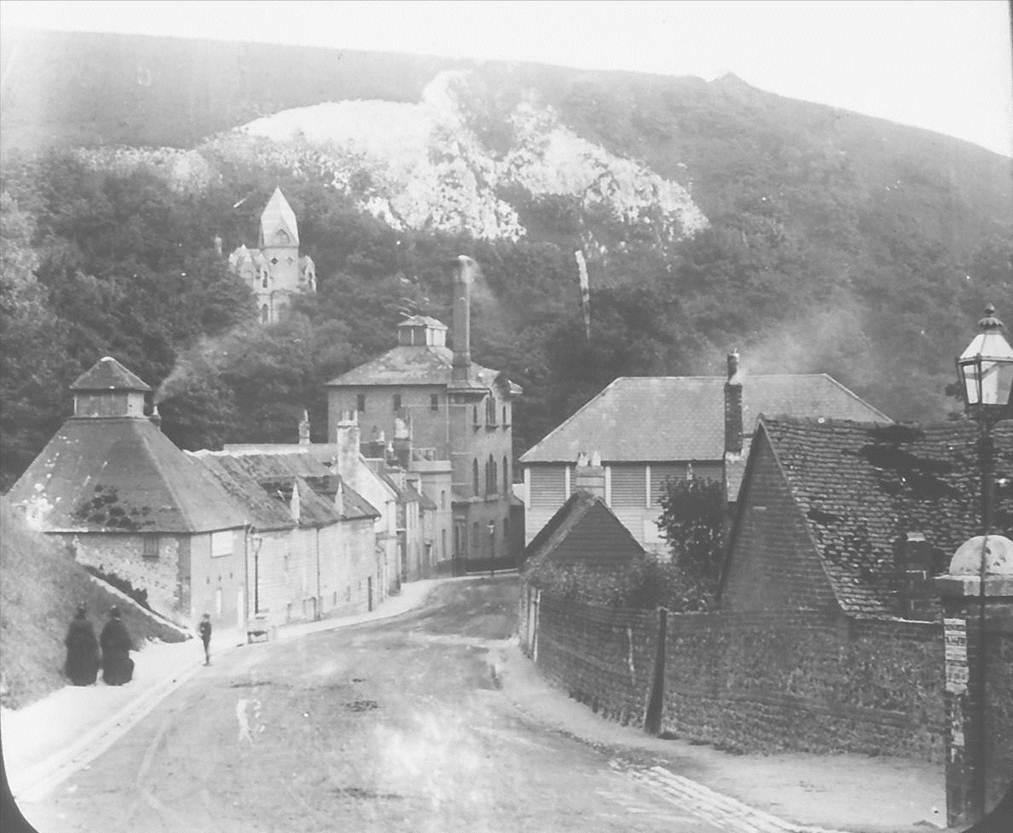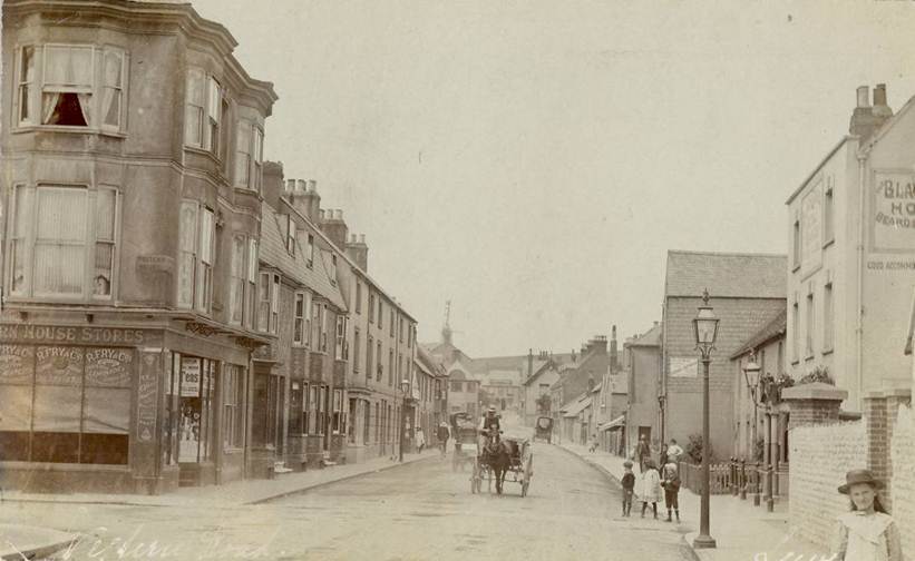 Truly a photo from another age – I particularly like the children in the road outside the Black Horse pub who are distracted from their pose by the approach of the horse and cart. The shop on the left is Western House Stores, with the name H Roberts (I think) above the door. The side windows are given over to advertisements for: R Fry & Co – Lemon Squash, Lime Juice Cordial, Ginger Beer, Lemonade, and Ginger Ale. The advertising board on the cottage across the street appears to read ‘Messrs Kennard’, but I can’t make out any other detail. Further up on the right hand side is the Rifleman pub, and facing down the road is the Windmill Inn.