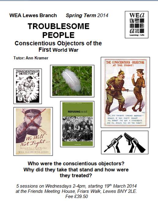 The first, on conscientious objectors, will be tutored by Helen Kramer and held over five Wednesday afternoons starting on 19th March 2014. It will be appropriately located at the Friends Meeting House, Friars Walk.