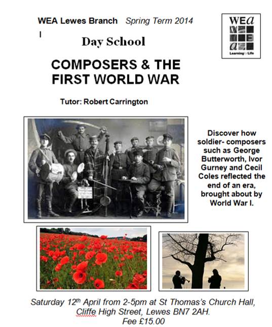 The second, on the soldier-composers in the Great War, will be a day school tutored by Robert Carrington held on the afternoon of Saturday 12th April 2014, at St Thomas’s Church Hall, Cliffe High Street.