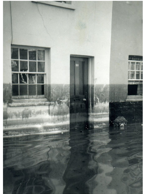 A delivery van and a Land Rover navigate the floods on Malling Street, passing the Wheatsheaf Inn, owned by Beard’s Brewery.