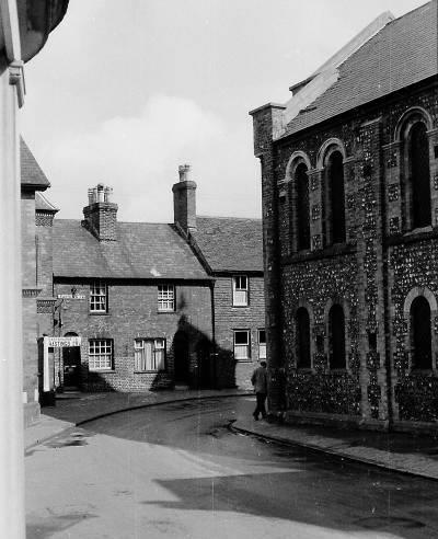 There is a side view of Eastgate Chapel, and if you magnify the picture you can read ‘Eastgate Street’ on the street sign. The fingerpost points the way to Hastings (via Cliffe Bridge and Cliffe Corner), but there do not seem to be many alternatives open to the driver.