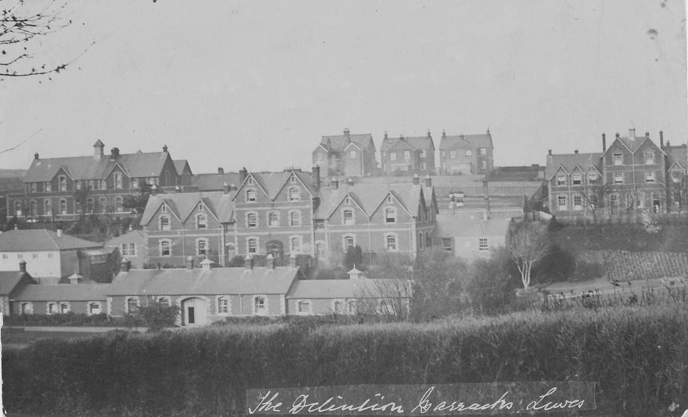 This postcard showing the old Lewes Union Workhouse, called at this date ‘The Detention Barracks, Lewes’, was dated 16 April 1916 and sent to a serving soldier at the front. The recipient was presumably one of the ‘gunners’, probably the Lewes Territorial Company of the Royal Garrison Artillery. The card was evidently sent in an envelope, and the message reads:
