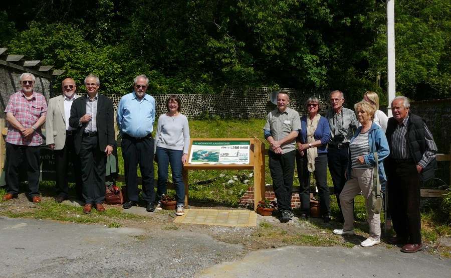 Group photo: Immediately left of the board are Trevor Beattie, Robert Cheesman (Chairman of Friends of Lewes) and Bridget Millmore; the Ranger Mark Hayward is immediately to the right