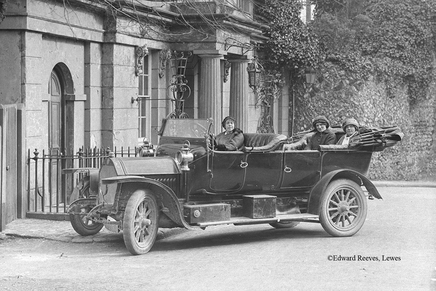 A 1917 Edward Reeves photograph of a motor car with a lady driver outside Castle Gate House