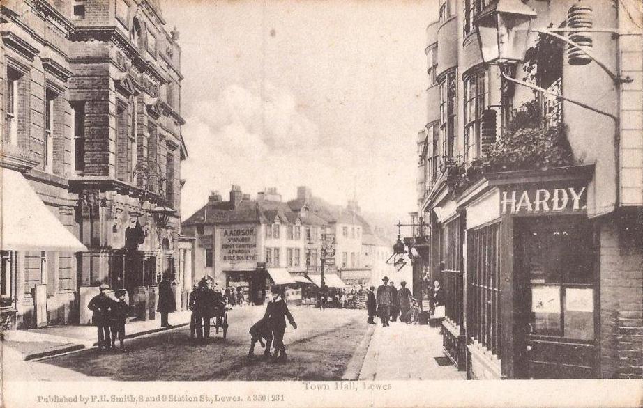 This postcard featuring Lewes Town Hall was published by F.H. Smith of 8 & 9 Station Street, just round the corner. This particular postcard carries a 1908 postmark.