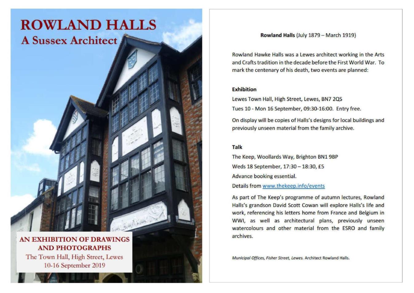 Rowland Hawke Halls (July 1879 – March 1919) was a Lewes architect working in the Arts and Crafts tradition in the decade before the First World War. To mark the centenary of his death, two events are planned: