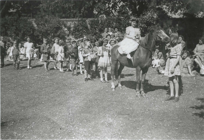 In 1946 I took part in the May Day Revels organised by my school, St Anne’s Infants School in De Montfort Road. This was an annual event under the direction of the head teacher, Miss Anne Dumbrell, who was very keen on country dancing. We had to rehearse the Maypole dancing in the school playground, to thread the coloured ribbons around the pole in a set pattern. The pole had a wooden stand so that it could be set up in the playground, and then transported to the venue. The event was held at the Castle Bowling Green, then part of the garden of Dr J.A.H. Smart. We processed from the school via he twitten through Castle Banks into the Castle Precincts. The procession was led by the May Queen, Pat Robins, riding a pony and, aged 7, and her two attendants. I was one of three drummers who followed her.