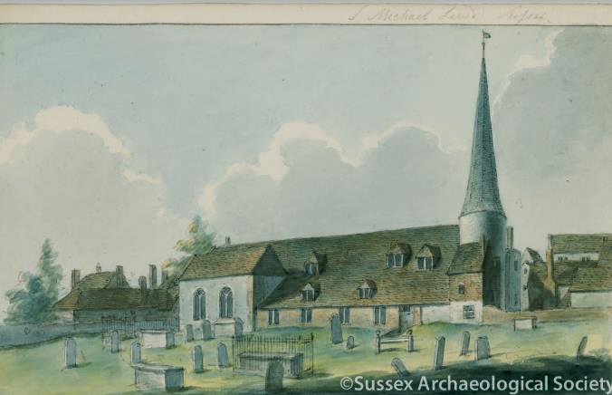 This view of St Michael’s church, unusually shown from the north, is from the Sussex Archaeological Society’s Sharpe Collection.