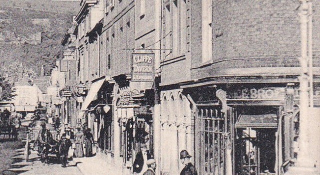 To the right, after the Rice Brothers saddlers shop, was the inn sign of the Cliffe Tavern, proprietor G. Edwards. Bulletin no.95 identifies G. Edwards as the licensee there in 1902.