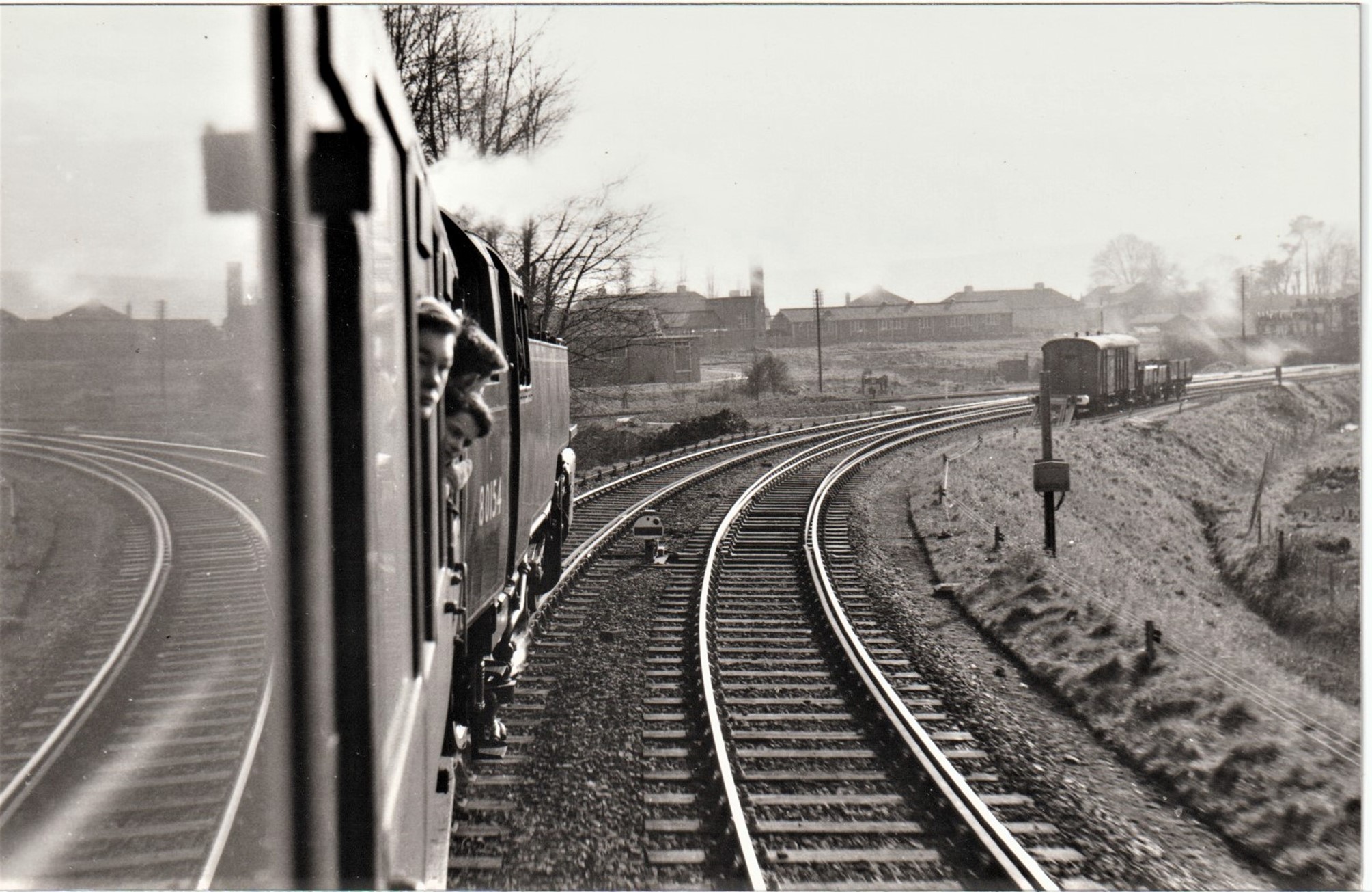 The second and third photographs both feature the same British Rail 2-6-4 tank engine no.80154, the last locomotive ever built at the Brighton Locomotive Works, in 1957. One, taken by Les Elsey, shows it leaving Lewes and climbing Falmer Bank on 13 April 1958. This shows what the (wild) western end of Lewes looked like before the Barons Down housing estate smothered it.