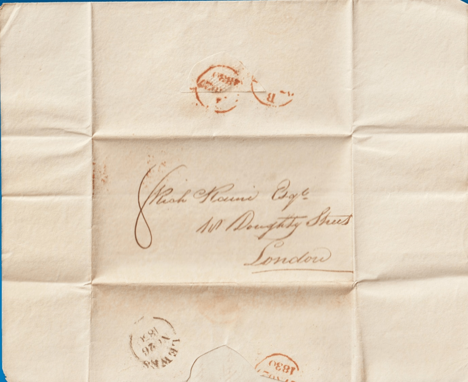 The letter below was sent from Lewes to London in November 1830, a decade before the establishment of the penny post, and was a routine acknowledgement of the payment of an account. The sender was Thomas Hillman (1810-1856), at the time aged 20, the second son of the Cliffe corn, coal and lime merchant John Hillman (1780-1864), whose counting house, wharf and coal yard were at 24 Malling Street, next door to the Dorset Arms. The paper on which the letter was written was cleverly folded to create an envelope, closed with a flap and a slot cut in the paper. The envelope was postmarked by the letter carrier. The recipient was Richard Raine, a well-known London surveyor, who often acted as an enclosure commissioner.
