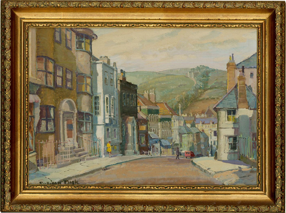 This attractive framed oil painting of School Hill signed Sullivan Pugh is currently on offer by Sulis Fine Art for £249 [see https://www.sulisfineart.com/norbert-sullivan-pugh-framed-20th-century-oil-lewes-high-street.html]. Norbert Sullivan Pugh was evidently quite a prolific artist, as Google reveals a range of broadly similar 20th century paintings of traditional landscapes and streetscapes.
