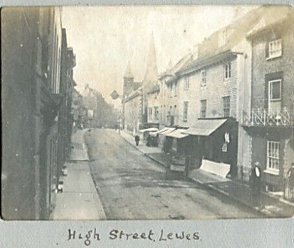 These two rather grainy photographs of Lewes High Street were included in a souvenir album of Sussex photographs created, probably after a holiday, by C.W. Murray dated ‘Summer 1902’. He also visited Newhaven, Hamsey, Ditchling, Westmeston, Hurstpierpoint, Southease and Litlington.The album attracted competitive bids when offered for sale on ebay.