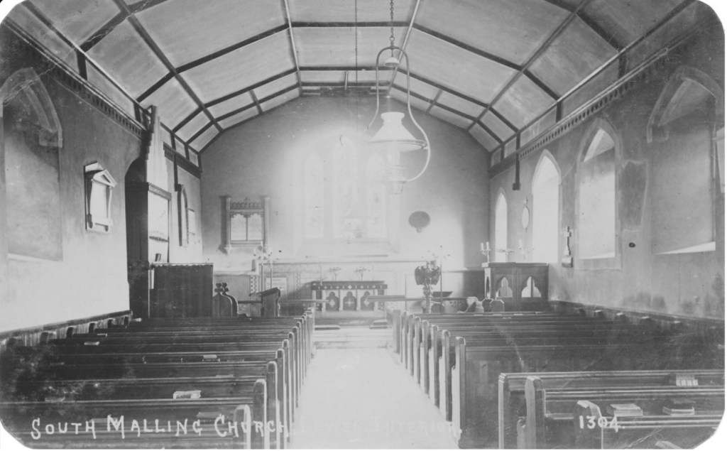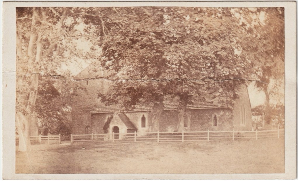 A pair of small photographs of the exterior and interior came into my possession recently, acquired via ebay. The approximate size of cartes de visite, and mounted on card, they are identified as South Malling on the reverse in a hand from a century or so ago. The exterior view of the church looks quite similar to early Edwardian postcards views, though there is a little ivy on the church porch, and the 4-rail post and rail fence looks a little newer. On the reverse a modern hand has added ‘Trinity Church 1865’ but that does not seem credible. The A.H. Homewood and Mezzotint postcard views were taken in winter, but the new view was taken when the trees were in leaf.