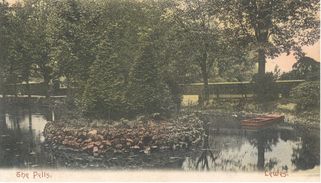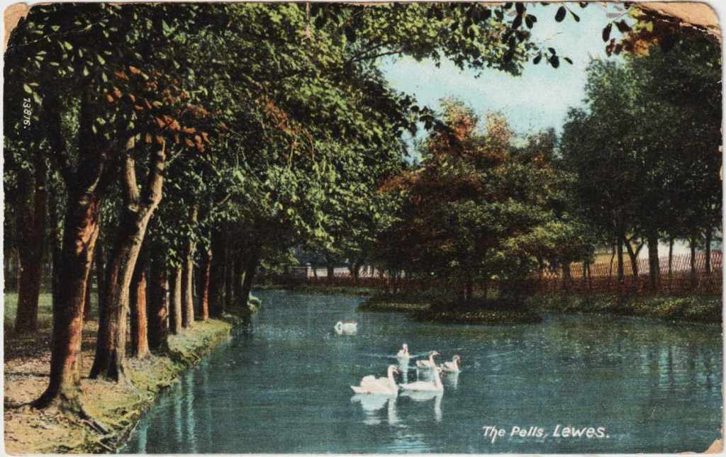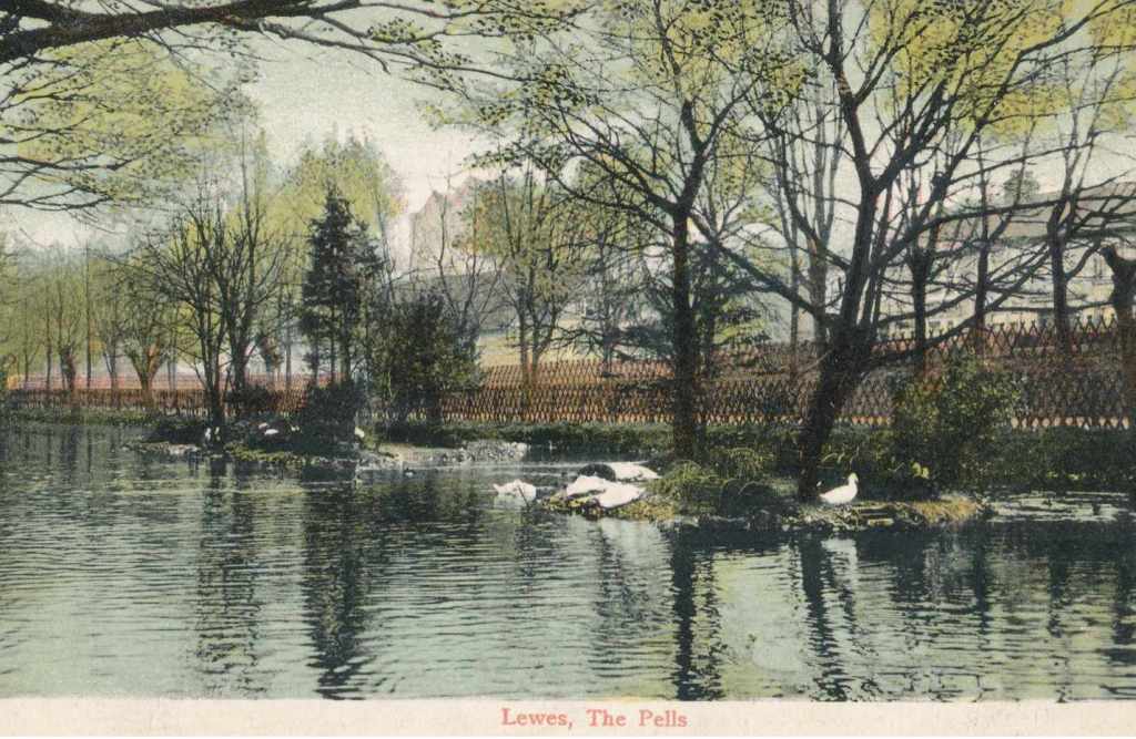 The establishment of the Pells as an area of parkland surrounding water bodies once used to power the paper mill has been fully described in ‘The Pells of Lewes’, edited by Ruth Thomson & Sarah Bayliss and published by the Lewes History Group in 2020. Their importance in the town’s recreation in the first quarter of the 20th century is well illustrated by the large number of picture postcards of the area published in this period. The majority of these postcards are hand-coloured – a laborious process in the days before colour photography. Below are some examples of these postcards, showing where townsfolk and visitors would gather, walk, and feed the ducks and swans.