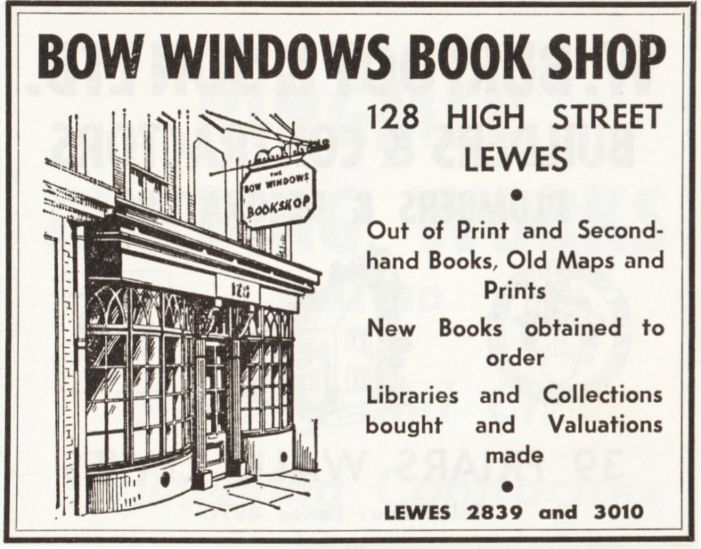 This advertisement for the Bow Windows Book Shop when it was based at 128 High Street, on St Anne’s Hill, is taken from a trade advertisement in the 1968 edition of Kelly’s Directory for Lewes