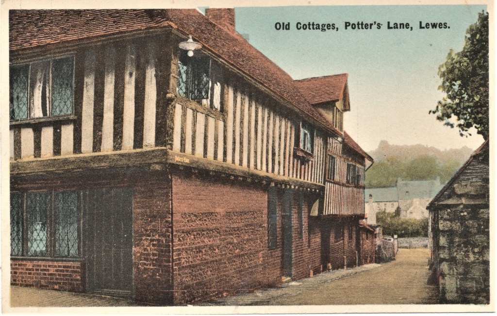 The image bears a striking resemblance to a common 1920s postcard of Potters Lane, with the details of the doors and windows a very close match. There are, however, a couple of intriguing differences. In the drawing the cottages are thatched, while all 20th century postcard views show them tiled. Also in the drawing the surfaces of Potters Lane and Southover High Street are shown as cobbled, which contemporary postcards do not suggest. Is this artistic licence? It seems unlikely that the “ ‘26’ “ means 1826 rather than 1926, as the Christian name Leslie, which derives from an Aberdeenshire surname, was rarely used in England before the second half of the 19th century. No artist of this name is known to Google, or to the standard reference works on exhibiting artists.