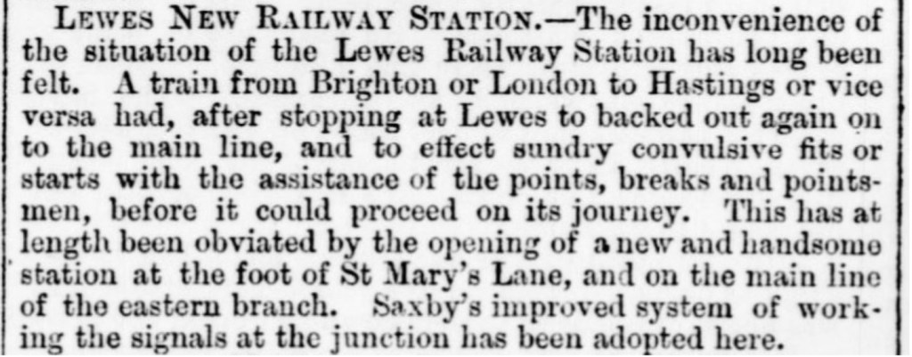The 5 November 1857 Brighton Gazette explains the reasons for building a new Lewes railway station at the bottom of St Mary’s Lane barely a decade after the elaborate initial version had been completed at the end of Friars Walk, where the Premier Inn now stands