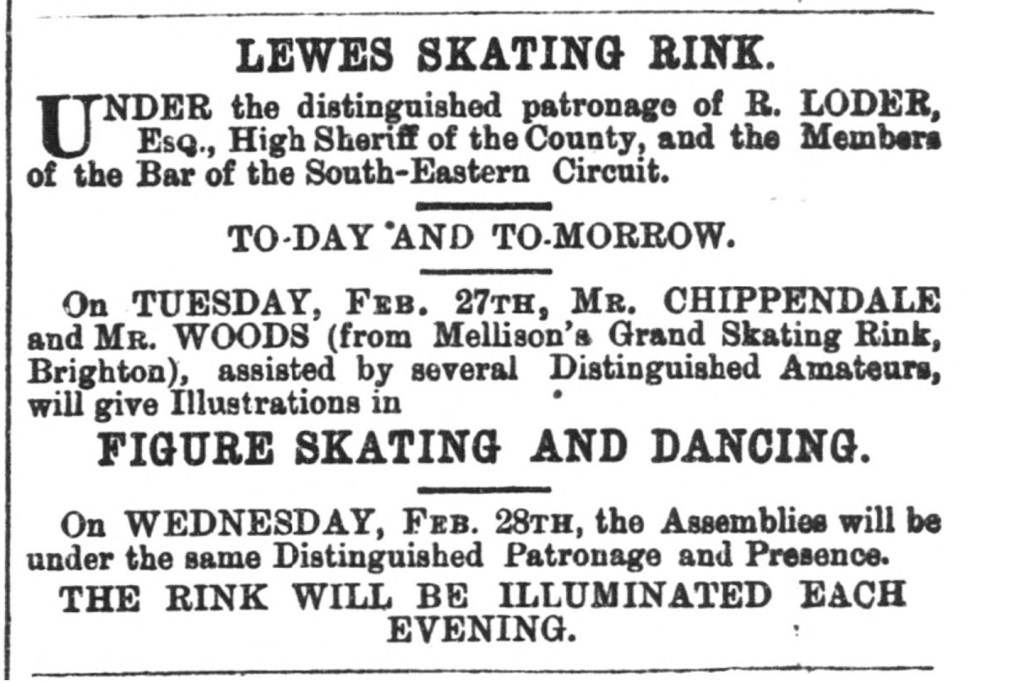 “It will be seen by an announcement in our business columns that special arrangements have been made for the Lewes Skating Rink during the present week. The patronage of the High Sheriff of the county has been kindly conceded and the presence and aid of Mr Chippendale and Mr Woods, two of the most celebrated and skilful amateur rink skaters of the day, have been secured. The hall will be brilliantly illuminated and a ‘feast of lanterns’ forms part of the programme. The presence of so large a number of persons as the business of the Assizes invariably congregates from all parts of the county will naturally swell the attendance at the rink on the coming occasion. Fortunately the area of the rink is fully sufficient, not only conveniently to accommodate a considerable body of spectators, but also to afford ‘ample space and verge’ for the unimpeded exertions of the skaters. There will doubtless be very full gatherings.”