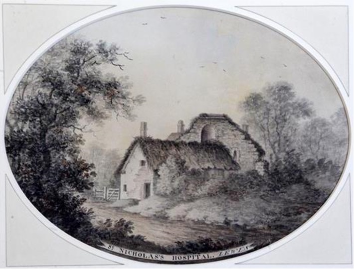 The print of St Nicholas’s Hospital below comes from Rev Pierre du Putron ‘Nooks and Corners of Old Sussex’, a volume of old engravings published in 1875 by the rector of Rodmell. It is clearly a very similar view to the 1779 watercolour by James Lambert (1741-1799) included in Bulletin no.86 (reproduced below), but not quite the same image.