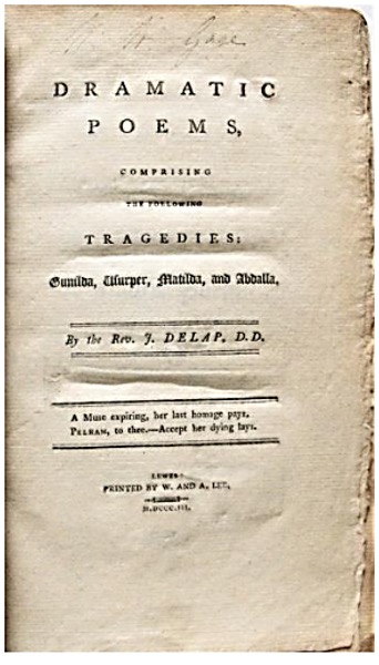 Sources: John Delap is the subject of articles in Wikipedia and the Dictionary of National Biography. This article is based on my larger study of his life – timothyambrose@btinternet.com. He is also mentioned in Heather Downie, ‘The South Street Story’. For further information about Kingston and Lewes in the long eighteenth century, see Charles Cooper, ‘A Village in Sussex, the History of Kingston-near-Lewes’ (2006) and Colin Brent, ‘Georgian Lewes 1714-1830 The Heyday of a County Town’ (1993). The image above shows the title page of one of his publications, printed in Lewes by William & Arthur Lee, from the library of the Gage family at Firle.