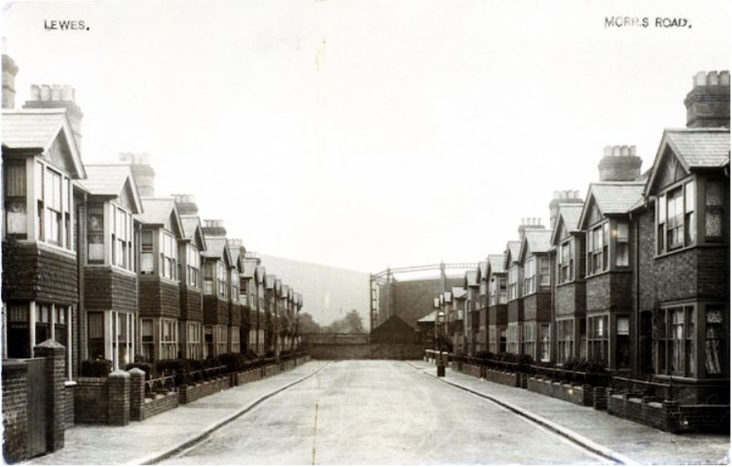 This postcard image shows Morris Road, with one of the gas holders belonging to the Gas Works in the background. There are a number of glass negatives of this area in the collection now at The Keep taken by Lewes solicitor’s clerk Henry John Bartlett (1878-1965), who lived at 14 Morris Road after his marriage [ESRO ACC 8509/1]. Many of his images were published as postcards by a range of different publishers.