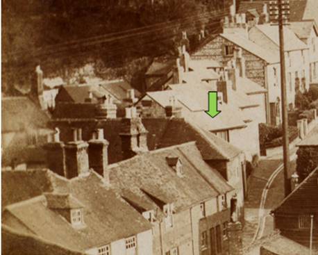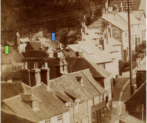 The 1900s photograph below shows tantalising glimpses of the roof of the substantial workshop (blue arrow) and part of the roofs of the cottages at Nos. 10 and 11 (green arrow). We know from later OS Maps that the properties were still there well into the twentieth century. However, by the 1960s, they had been pulled down and the land on which they once stood was used to make some small back gardens for the adjoining properties. Despite Nos. 10 and 11 no longer being in existence, there are still gaps in the numbering of Chapel Hill for where they used to be.
