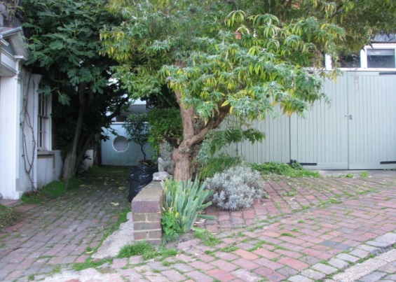 There is now just a single-storey garage belonging to No. 9 on the site of the old coach house. You can see this garage in the photo on the right, set back from the road behind a brick forecourt. This photo also shows a brick-paved pathway on the left hand side which provides access to No.12 (and also to No.9). The porthole window to No.12’s studio can also been seen at the end of the pathway.