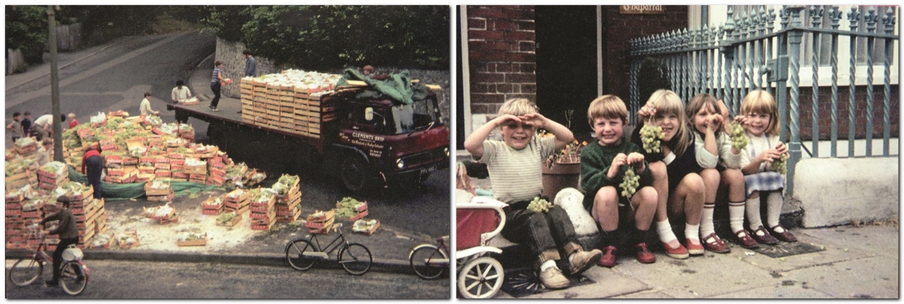 When asked what events people remember in the street, the incident with the grape lorry is frequently cited. One former resident (a child at the time) thinks this incident occurred either in the summer of 1970 when she finished primary school or in 1971 shortly after her cat died on 23rd July.