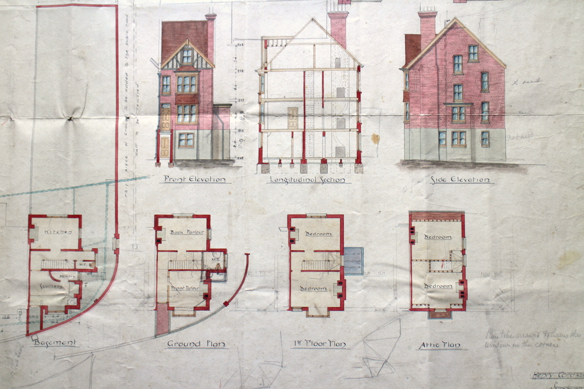 The most recent buildings on the south side: current nos 24-29 and 33 to 41; were built at the beginning of the twentieth century. They are in the same gabled style as shown in these hand coloured plans of 41 Grange Road prepared by Henry Card, A.I.C.E Surveyor. There is a penciled date (27.8.1902) on the lining of the living room door of no 41 that probably indicates when it was completed.