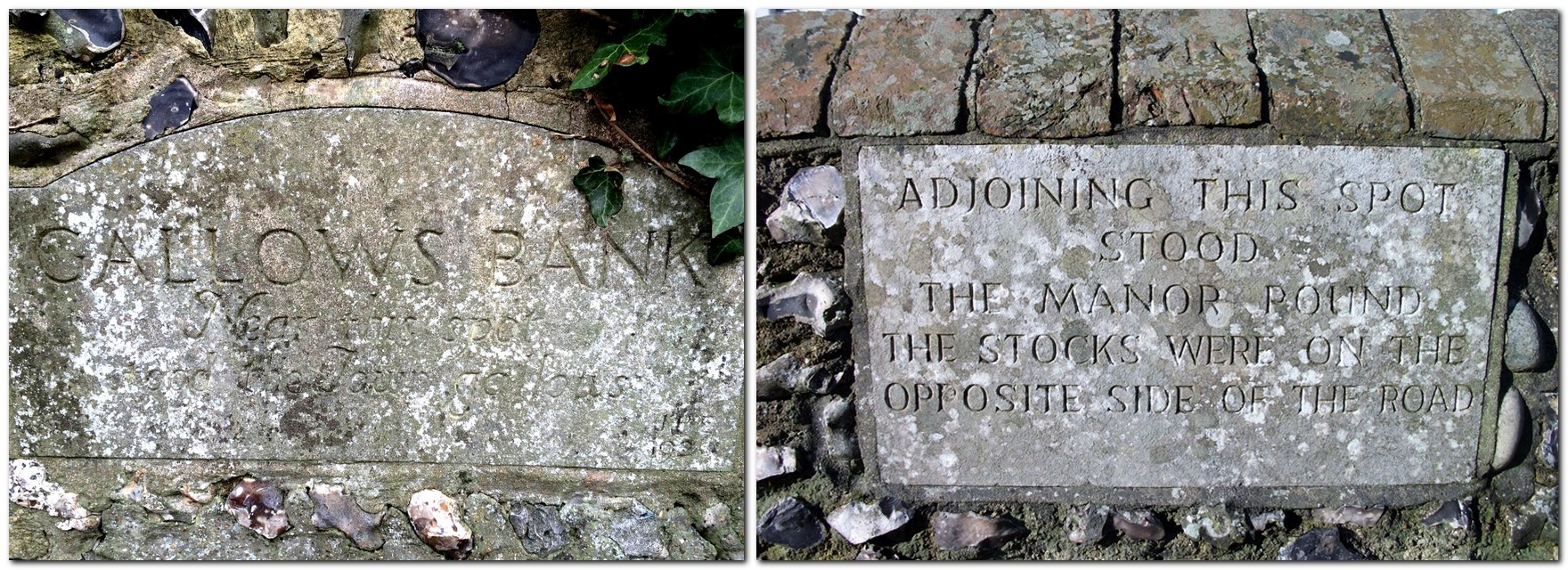 Left: Plaque marking the gallows. Image from Fred Hoads, on Lewes Past; Right: Plaque marking the site of the manor pond and the stocks (Click image to enlarge)
