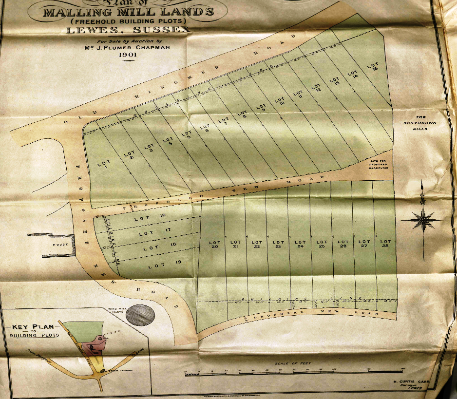 Leaver decided to sell the land adjacent to the laundry. The plan[36] shows the freehold building lots put up for auction at the White Hart Hotel in June 1901. Mill Road is referred to as Old Ringmer Road.
