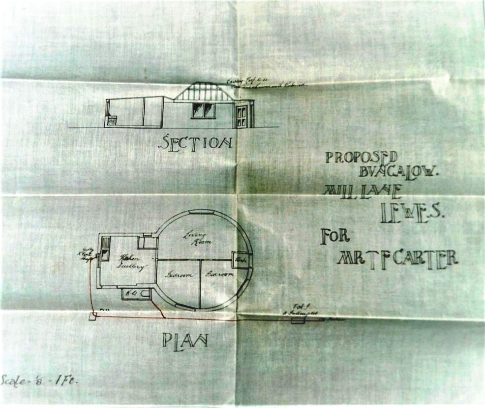 In October 1925 Thomas Frampton Carter, managing director of the East Sussex Sanitary Steam Laundry Co., resident at Mill House, which the company owned, and later Mayor of Lewes, applied successfully to the Borough Council for permission to convert the surviving lower storey of the roundhouse into a single-storey dwelling. The work was undertaken by T. Sands, builder of 18 New Road, Lewes. It included adding an extension to the east of the building to accommodate a kitchen, scullery and toilet. The millstone became the doorstep to the bungalow.
