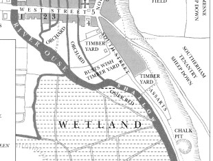 A map (from Colin Brent’s book Pre-Georgian Lewes) of 17th century South Street (detail below) shows the timber yards, chalk pit with wetland and osier bed (willows for basket making). Note the drain on the lower side of the osier bed where a cut would be made to canalise the Ouse in the late 18th century.