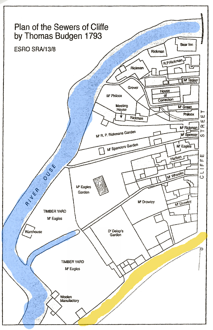 The river works included making a straight canal cut on the Ouse alongside South Street (the Cliffe Cut). This created an island on which lies the present boat club, and the channel on the South Street side, the original course of the river, became a backwater with a wharf and ship building.