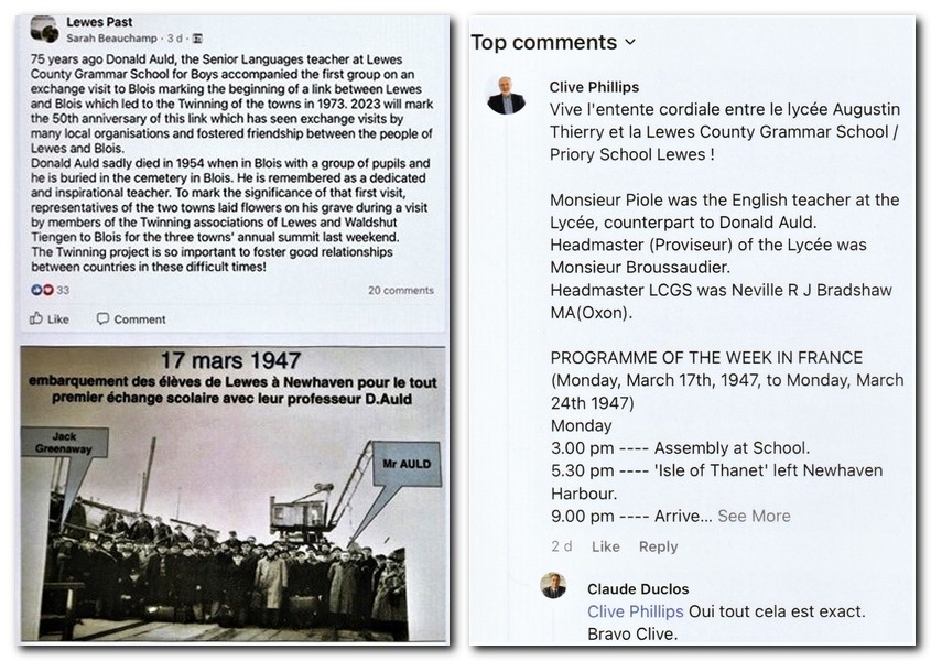Top: 1948 group photo outside Mairie at Blois, Below: Blois party 1949. From Old Lewesians Twinning website, and © 2023 OLO