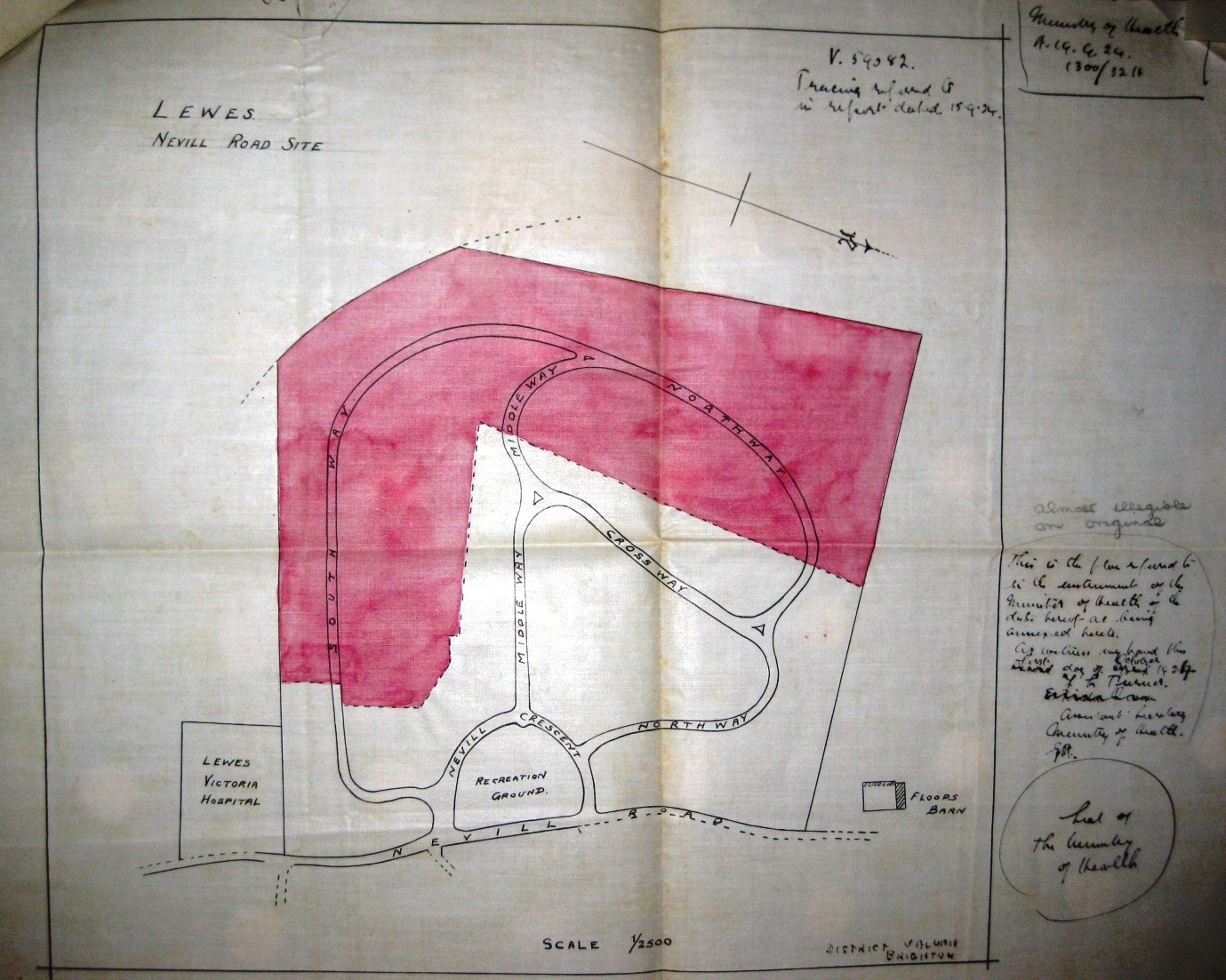 The Borough bought 39 acres of land on 5th November 1920 for £1,700 (Between £46 8s 10d and £81 an acre – compared with £1000 acre which was the going rate in the Paddock area, £600 for Wallands and £1,400 for St Swithuns.) 14 ¼ acres were to be “used immediately for the purposes of housing and the remaining sum of £1138 for the purchase of the remaining 24 ½ acres of the said land to be eventually used for the purposes of the said Act or for such other purposes in connection with the Housing of the Working classes as may hereafter be determined.” (17/4/20: “On motions by Alderman Every. (Chairman of Housing Committee)6 . The land had been farmed by Mr. Brown. Every congratulated him on the “splendid manner” with which he had cooperated with the committee. It seems from the Sussex Express September article above that the Council was in a hurry to build the housing even before the land had been finally purchased. On Monday August 30th Mayor Rudd had borrowed a spade to turn “the first sod on the Nevill road site on the spot pegged out for the first two dwellings” in a ceremony attended by Alderman Every and his deputy, other members of the housing committee, Mr Baxter the Town Clerk, and an architect.