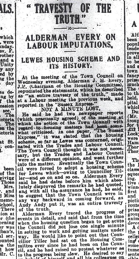 It was not long before there was an argument about who should get the credit for the new Lewes Housing Scheme. A month after the ceremony, on the first of October, a row broke out in the Sussex Express. A Labour candidate for the forthcoming local elections, Mr S.E Plummer, claimed that the Trades and Labour Council and Labour Councillor Tiller on the housing committee had to push the new housing scheme forward at a time when the “capitalists” on the Town Council thought it was not necessary.