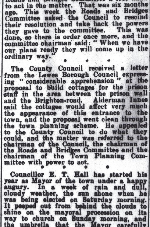 In February 1932 ‘Lewes Chat’ in the Sussex Express 18 was reporting that “the Housing Committee have made remarkable progress in the last year or two and the housing estate has become quite a little town with people clamouring for more.” It was a while before road construction caught up with the building. The road at the top of South Way, for example, was not finished until the middle of the 1930s when numbers 34 to 54 were still to be built. A generous gift by Alderman Every, of the Phoenix Ironworks, a recently retired member of the Council and Mayor between 1903 and 1905, was the incentive for its completion. Every had been chair of the Housing Committee in the planning stages of the Nevill. The Sussex Express 19 said he had given “33 years of unstinted and unselfish service to the council and the inhabitants of the borough”.